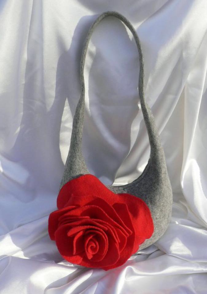 Основа сумки выполнена из достаточно грубой кардочёсаной шерсти, несколько проста и не побоюсь сказать - брутальна.... Но на её фоне распускается изысканная нежная роза, редчайшего, ультра-красного цвета. Вот такое сочетание несочетаемого и единство противоположностей. Кто знает, может это тот шанс стать самой привлекательной, единственной из многих....