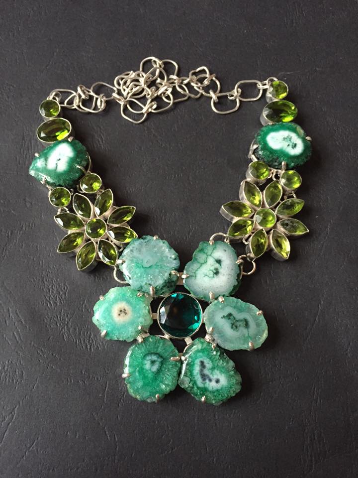Колье стерлинговое серебро, друзы, перидот, кварц