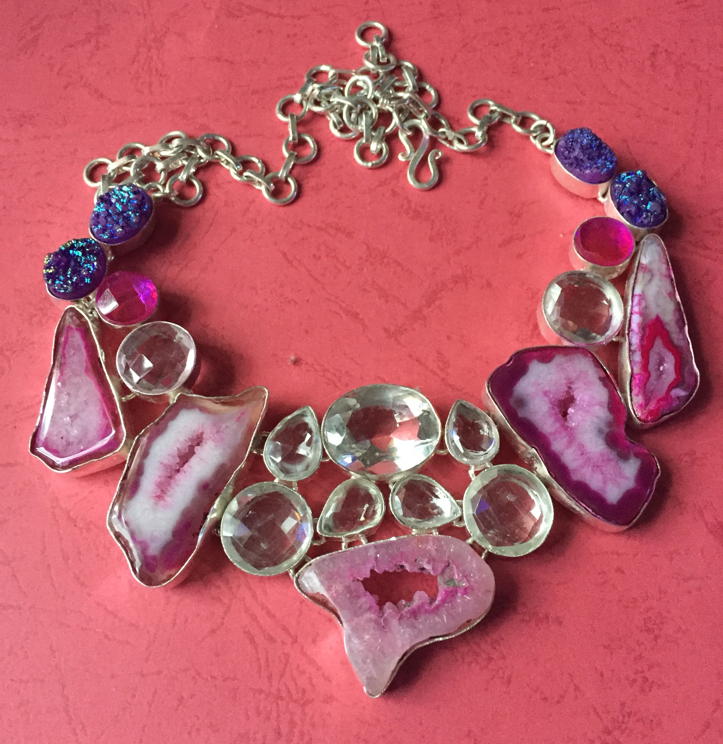 Прекрасное колье из стерлингового серебра, отлично подойдет на тонкую шею. Агаты, кварц, друзы в титановом покрытии.