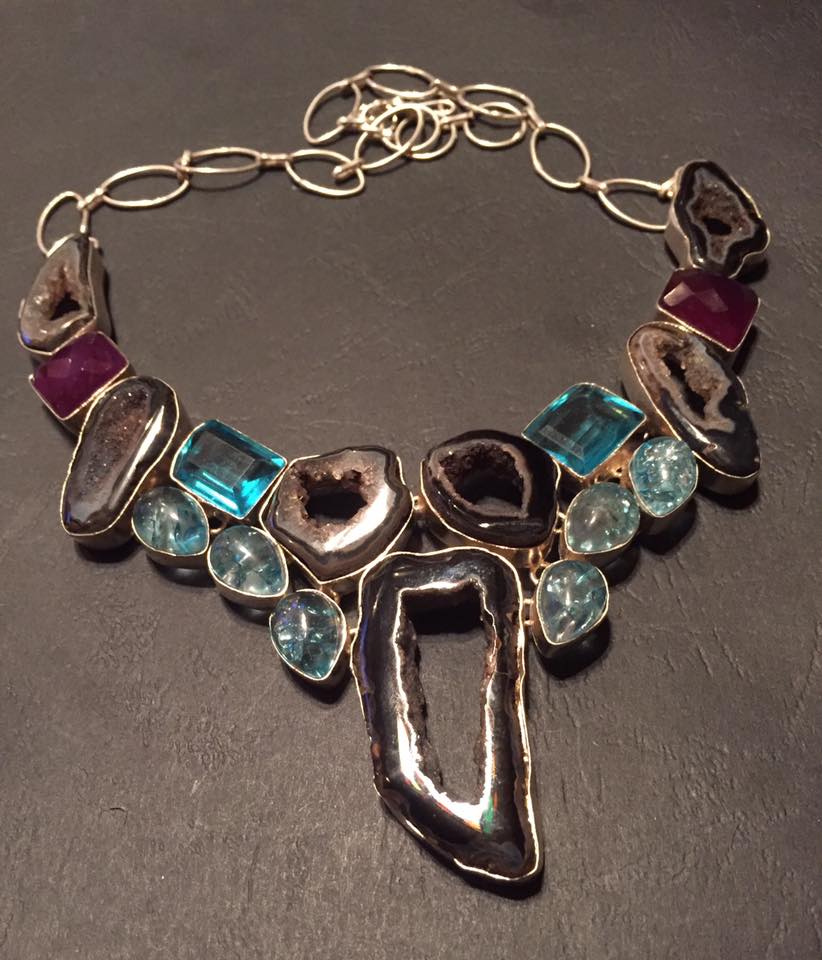 Колье, стерлинговое серебро, черный агат Ботсвана, голубой топаз