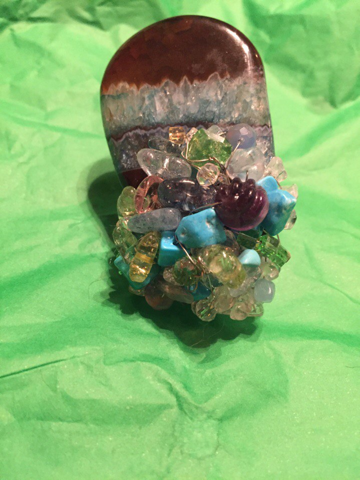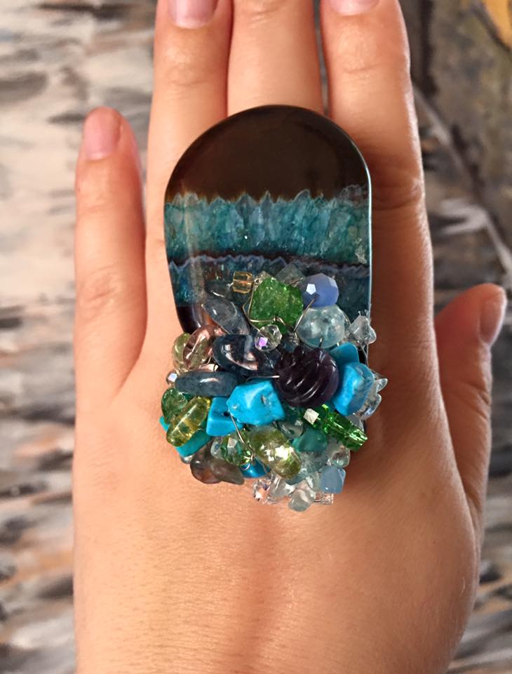 Крупное кольцо. Камни : агат, топаз,флюорит, кварц, аквамарин, бирюза, хрустальные бусины. Безразмерное.